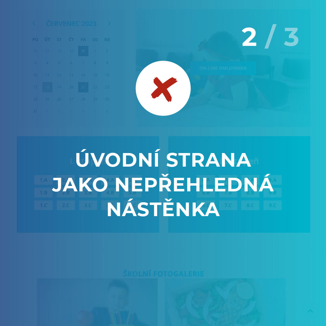 Neignorujte cílové skupiny. Zatímco pro učitele a žáky je primárně určen váš informační systém (Bakaláři, Moodle, Škola online atd.), web je důležitý především pro uchazeče. Základem, který by měla homepage splňovat, je přehledné menu obsahující záložky pro: