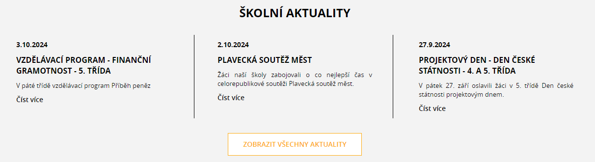 Zprávy o tom, co vaši školu čeká, jsou důležité zejména pro stávající žáky a jejich rodiče. Ať už jde o zábavný program (výlety, školní slavnosti), organizační záležitosti (aktiv, odstávka dodávky tepla), nebo jiné události (soutěže, olympiády), tento obsah by na vašich stránkách neměl chybět a měl by poskytnout dostatek informací.