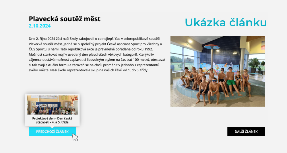 Pravidelné aktuality a články skvěle poslouží k propagaci školy. Jde také o známku otevřenosti vůči rodičům i širší veřejnosti. Naše webové řešení pro základní školy proto obsahuje také modul Aktuality, kterými můžete dát o vaší škole vědět. Editovat můžete název, datum i samotný obsah, správa je velmi jednoduchá. Výpis se pak zobrazuje v sekci pod bannerem.